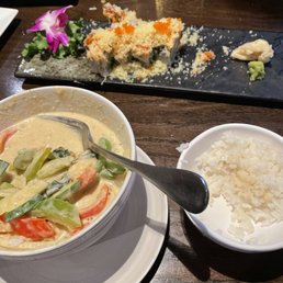 Had Thai basil very spicy, chicken satay and sushi a cucumber roll. Service was good nice looking restaurant. Thai basil wasn't hot enough asked for chili oil to spice it up also missing some galangal, lemongrass so it was missing some of that fresh flavor. Large portions though. Satay had no tumeric and I make better peanut sauce. Great ambiance. Soup and salad were great. Sushi nori wasn't toasted so it was a little soft with no snap. Critical bc I love my Thai. Will be back because Chicago is too far.